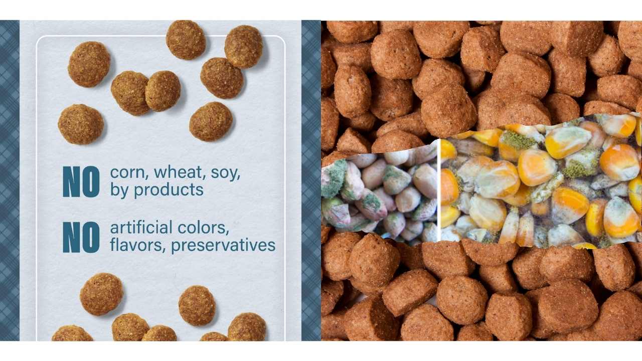 Avoid any food with corn. Feed less kibble and focus more on fresh, whole-food ingredients. There’s really no place for corn in pet food—especially when it’s a common source of aflatoxin.