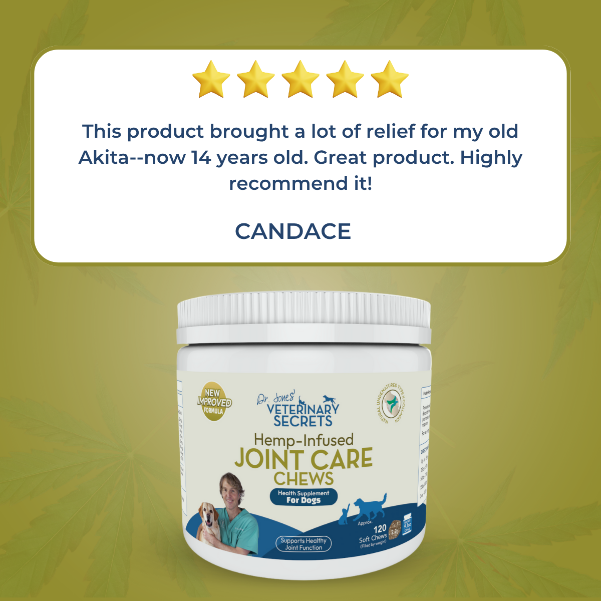 P.P.S. It only makes sense to give your pet relief without all the side effects. That’s exactly why I created my All-Natural Hemp Infused Joint Care Chews—dogs love them, and they really work.