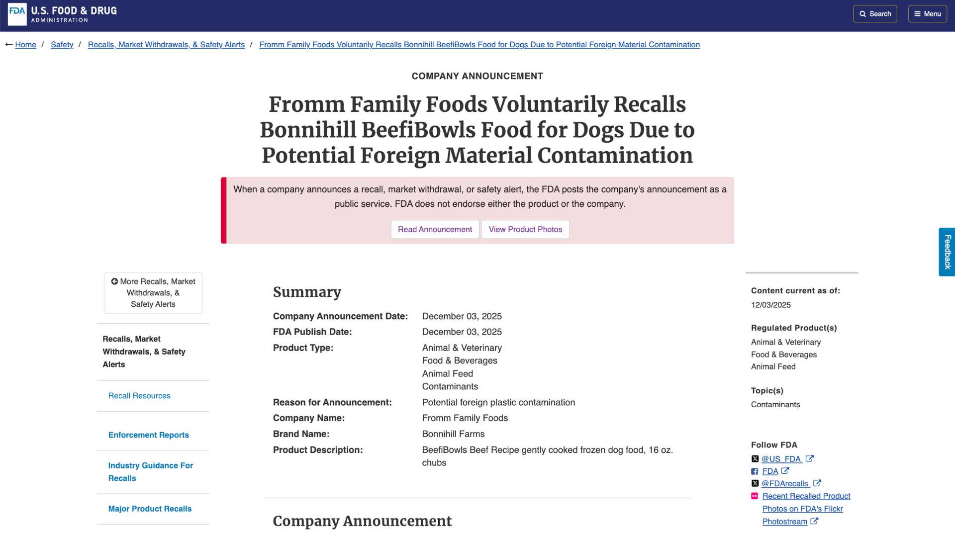 Dog Food Recall 2025: Plastic Found in Bonnihill Farms BeefiBowls