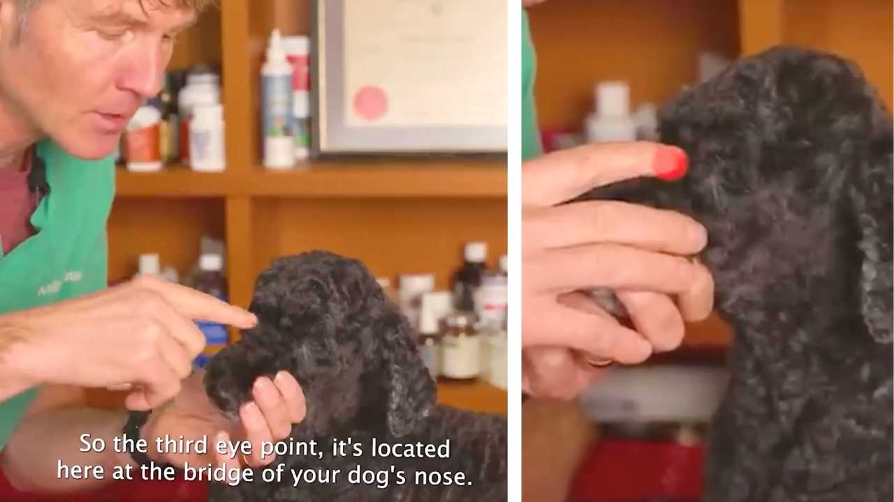 The Yin Tang point is located right between your dog’s eyes, at the bridge of the nose.