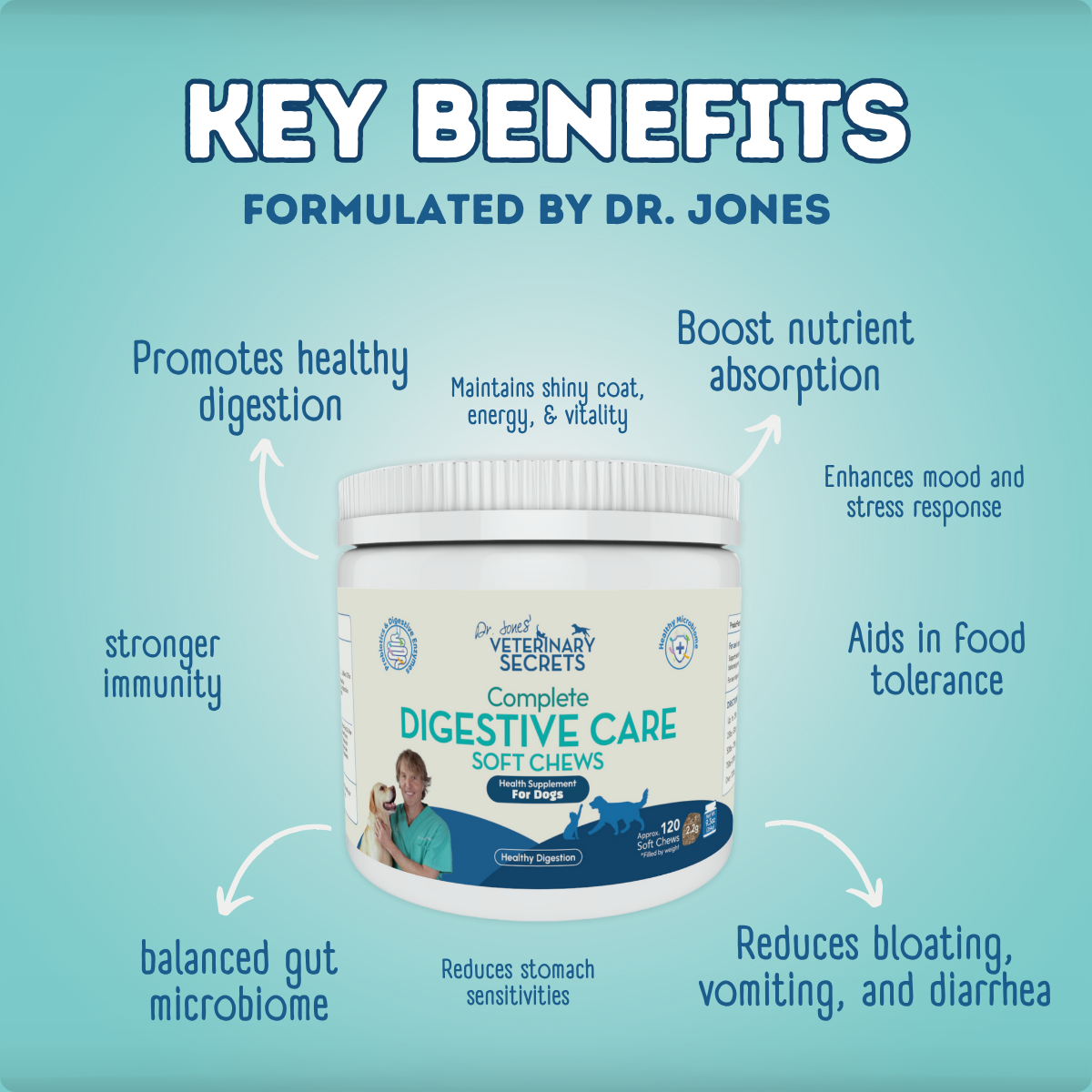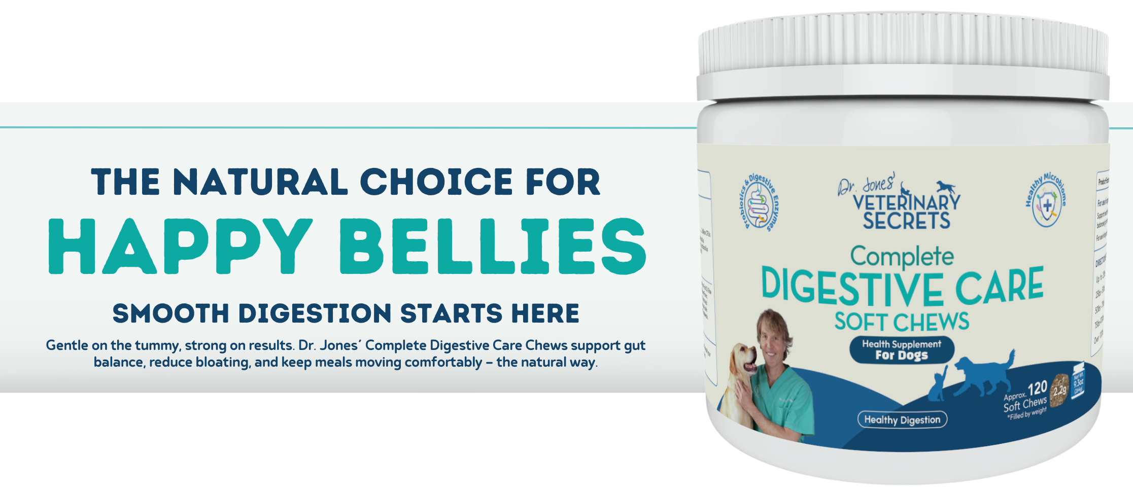 Try Dr. Jones’ Complete Digestive Care Soft Chews today to help stop reflux, bloating, and discomfort before they start.