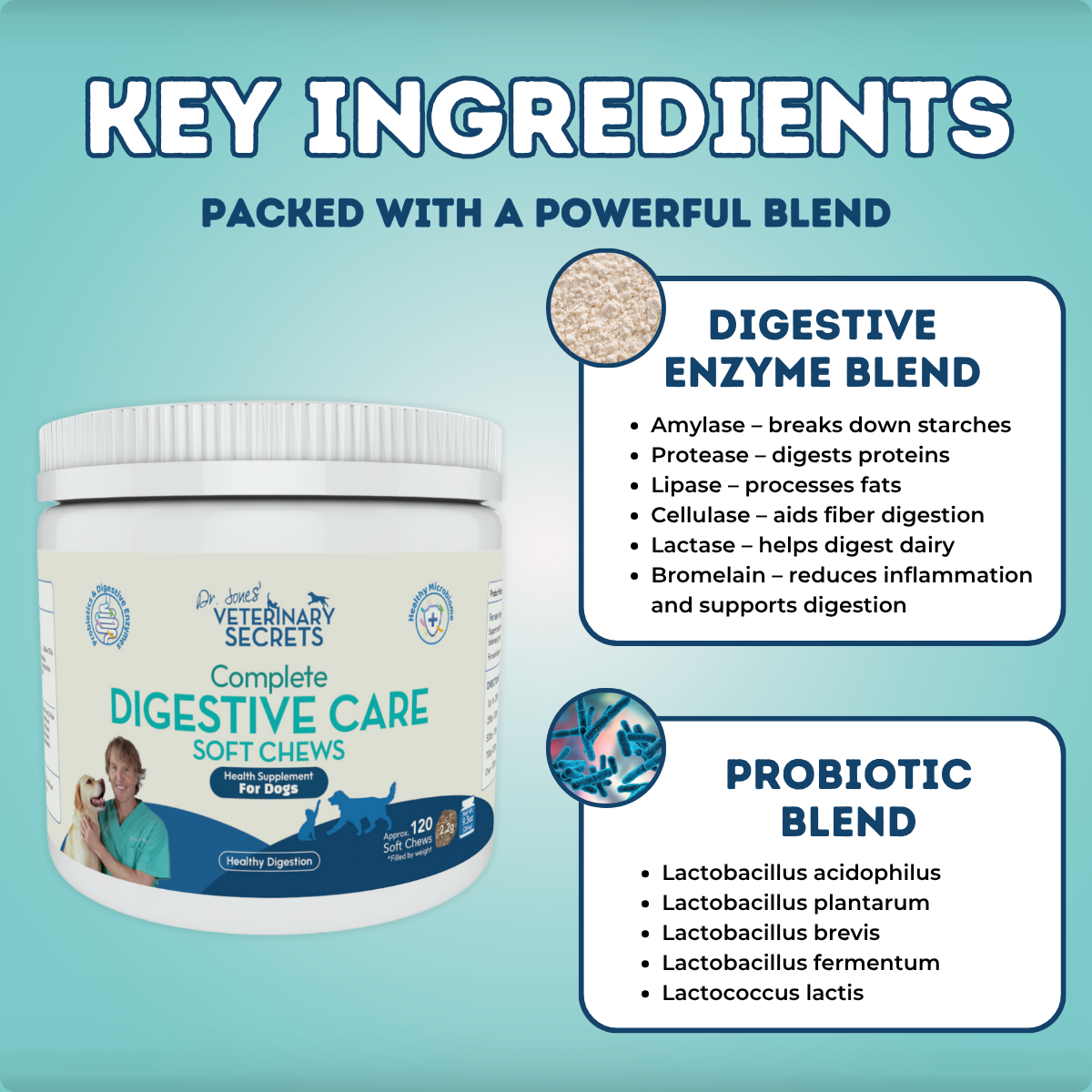 I’ve seen many dogs with chronic intestinal issues respond really well to digestive enzymes and probiotics. That’s why I developed Dr. Jones’ Complete Digestive Care Soft Chews. They’re designed to support healthy digestion and prevent the underlying problems that often lead to reflux.