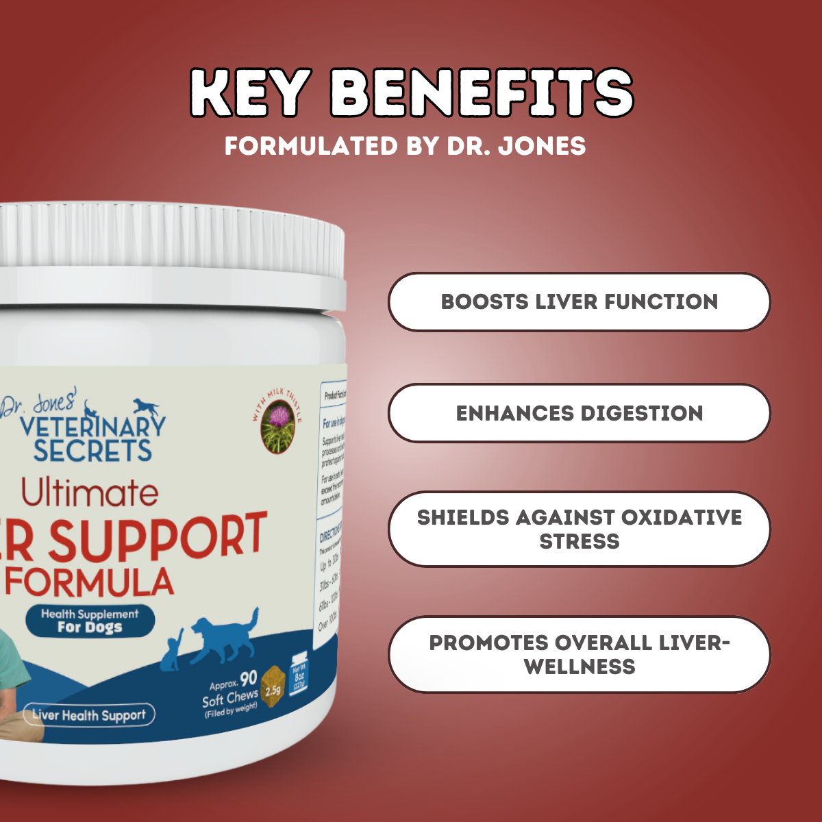 Formulated by Dr. Jones, these chews are vet-approved and designed with your pet’s health in mind. High-quality, safe, and effective—because your pet deserves nothing less. Every ingredient is carefully selected to support your pet’s liver at multiple level.