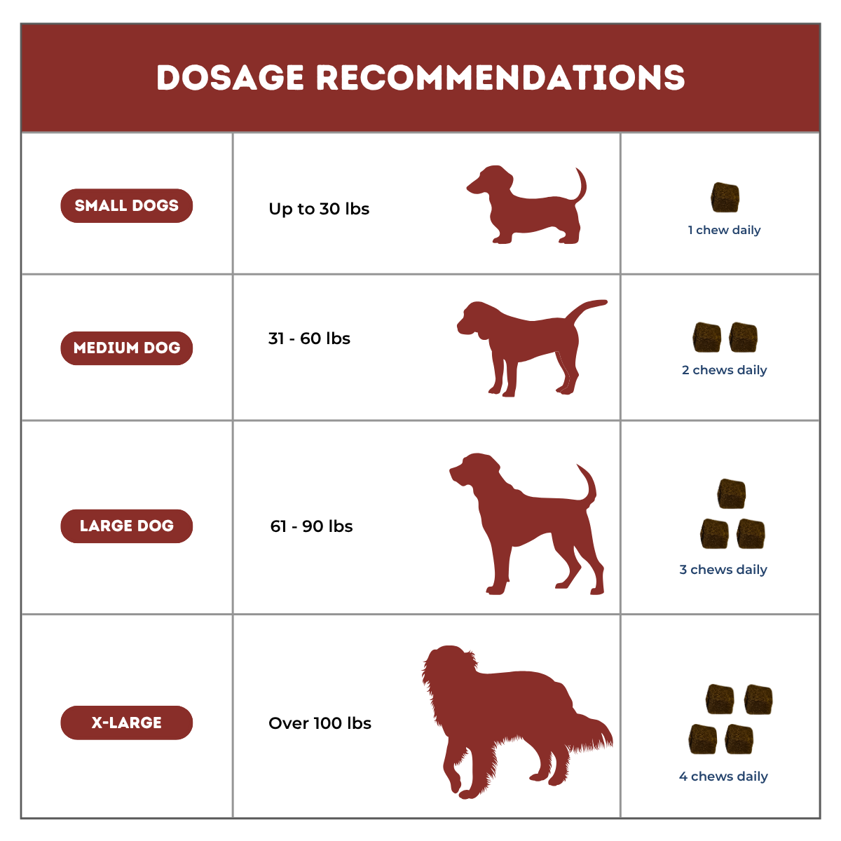 Dogs: 100 mg per 10 lbs, once daily