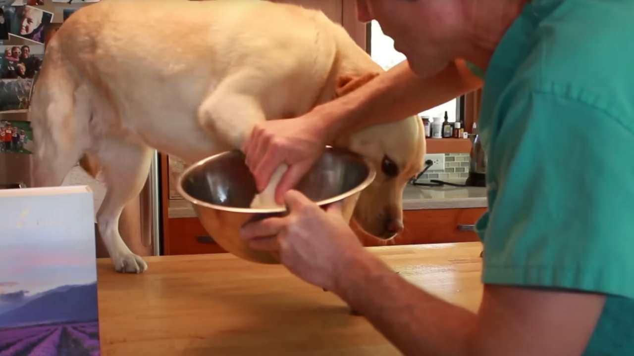 This is easier with small dogs like Pippy, but you can manage it with larger dogs using a shallow bowl or container.
