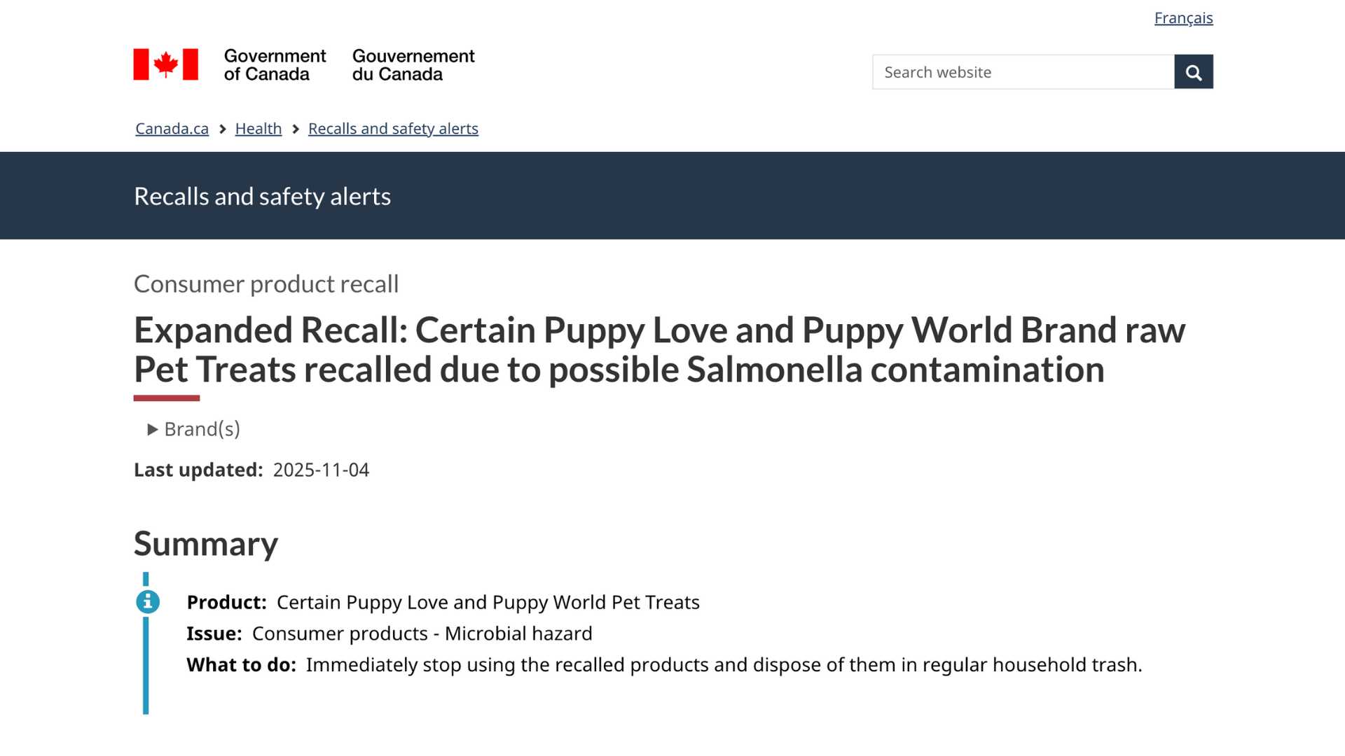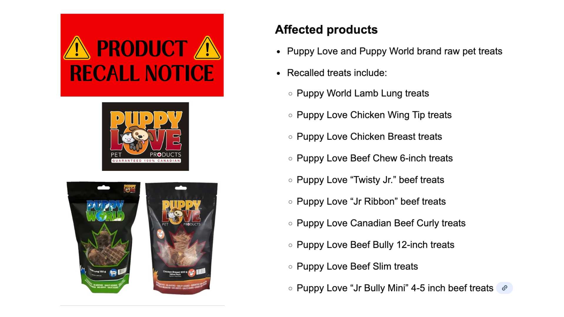 Another month, another pet food recall. This time the recall involves a company called Puppy Love, a brand mostly sold in Canada. The concern is around some of their raw dog treats, including freeze dried chicken.