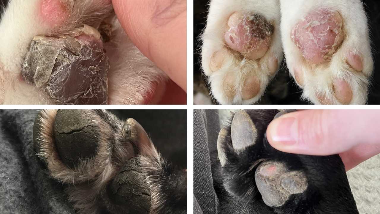 Dogs often have dry or cracked paw pads and noses. Applying Vaseline forms a protective barrier that locks in moisture. Often, within 24 hours, cracked pads are much improved.