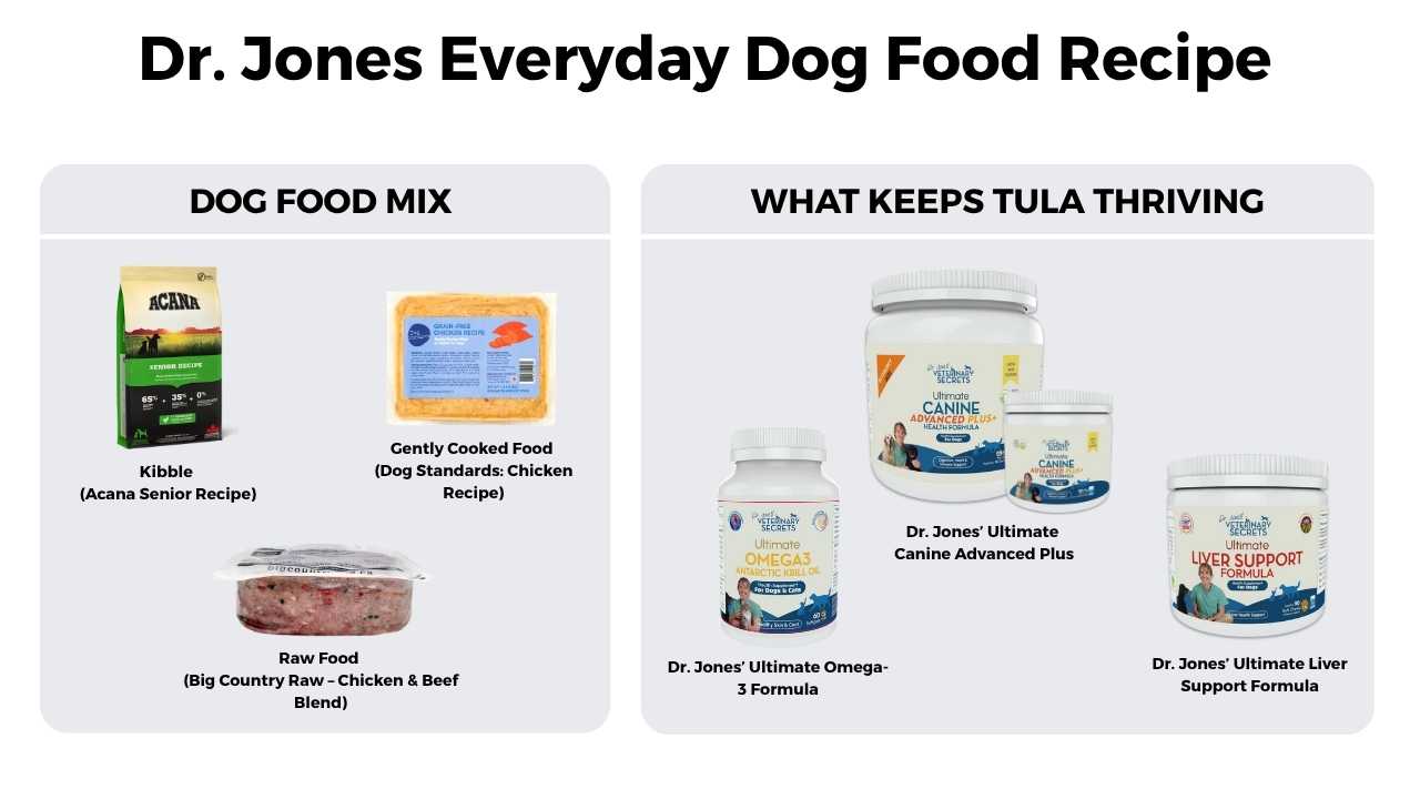 Along with real food, Tula takes a few supplements that help keep her joints, liver, and immune system strong.